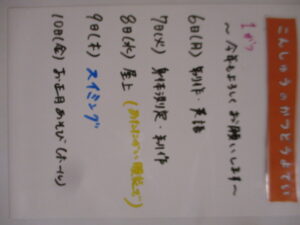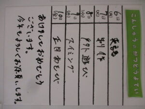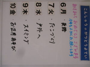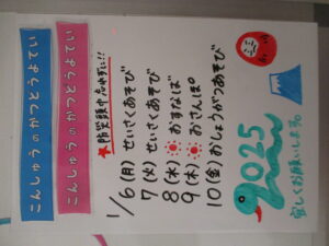 ◆◇1週間の予定◇◆1/6(月)~1/10(金) 2024/12/28 ※こちらに記載の予定は、天候や都合により変更になる場合がございます。ご承知おきください。 ※マチコミカレンダーで予定をご確認いただけます。あわせてご活用ください。 ==================== 【ぽかぽか組】 【きらきら組】 ただいま準備中です。 【わくC組】 【わくB組】 【わくA組】