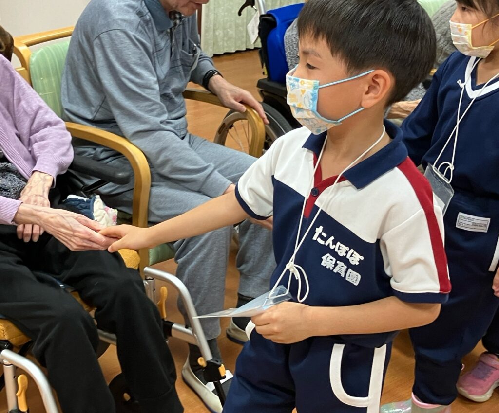 今日は今年度初めてのココファンさんとの交流会にいってきました。緊張していたお友だちでしたが、自己紹介をして、おじいちゃんおばあちゃんにたくさん可愛がってもらい、最後は「たのしかった!!」と笑顔で握手をしてきました♪ 一緒に歌を歌ってくれたことと、みんなの靴をたくさん褒めてくれたことが、何より嬉しかったようです(^^)
