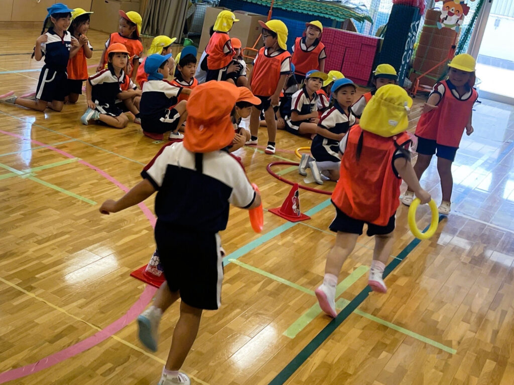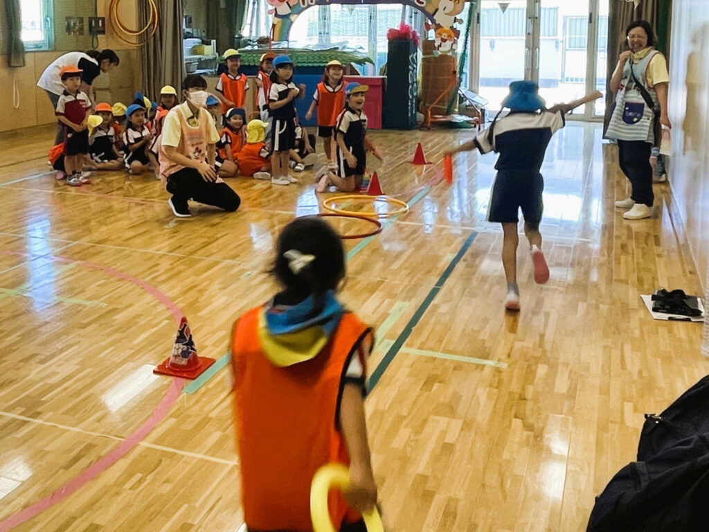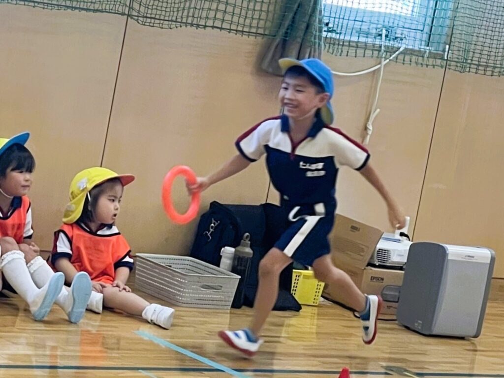 走るお友だちは全力でバトンをつなぎ、応援するお友だちは走るお友だちの力を後押しする声を出す。係にまわるお友だちは用具やスタート位置の準備をてきぱきと。