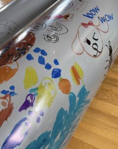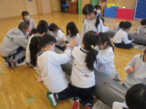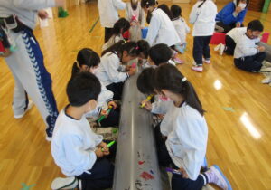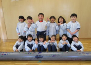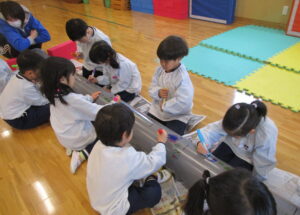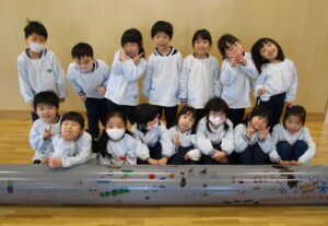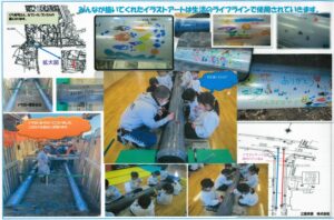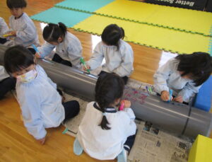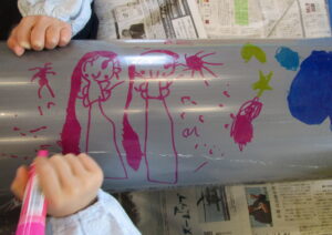 「下水道管に好きな絵、描こう!」と、地元の建設会社さんからお誘いが!! 下水管には「汚水管」「雨水管」「合流管」があります。みんなには「お家で使うトイレや台所、お風呂に使っている水が流れる管」と説明。長さ4メートル、直径25センチ・20センチの2本の管を目の前にし、「ドラえもんみたい~!!」という声も。