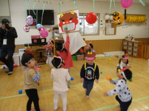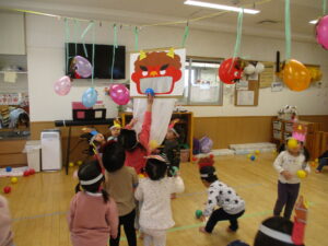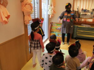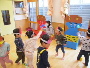 今日は節分集会でした。ホールでクイズや鬼のパンツを歌って踊ったあとは、お部屋に戻って『鬼退治』
