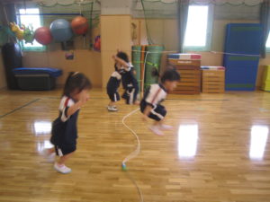 今日は、縄跳びをつなげてにょろにょろへびさん。