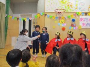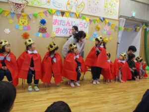 今年度最後のお誕生日会です。わくわくA*3名、わくわくB*2名、きらきら*2名、ぽかぽか*2名、総勢9名のお友だちが誕生日を迎えます。