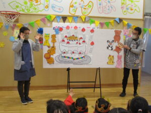 今月の出し物は「プレゼント」というパネルシアターです。練習を繰り返しても「うまく演じることができるかな」と毎回緊張するのですが、本番は子どもたちのパワーに助けられ、大成功(?)になります。思った通りだったり、意外や意外でそこに食いつくか!など、反応もとても楽しい!!
