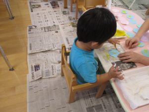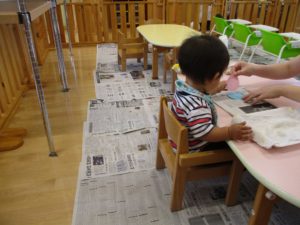 みんな絵具をつけることに抵抗もなく、保育士に誘導されて『ペッタン』『ペッタン』