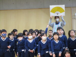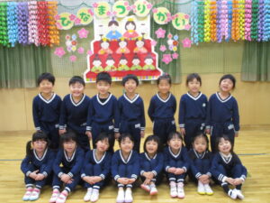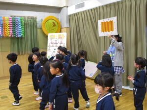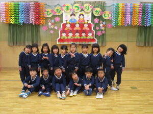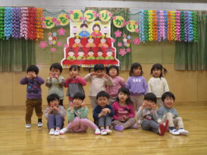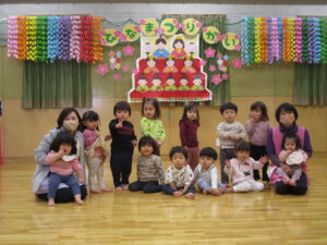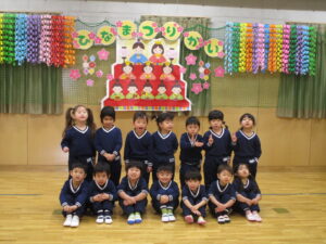 去年は、コロナの影響で各クラスでの実施でしたが、今年は全クラスで集まり、ひなまつり会を開催!ひなまつりの由来のお話や「うれしいひなまつり」の歌とパネルシアターにあわせてひな壇の飾りつけしました。ひな人形の名称を聞いてみると、答えられるお友だちがたくさんいてびっくり!各クラスのひなまつり制作の紹介もあり、どれも素敵な作品でした♪