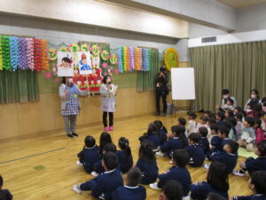 ▼その後、わくわくさんは、ホールでひなまつりのクイズを行いました!