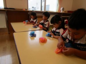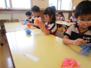 とても上手にじゃばら折りをして、その後一枚ずつ開いてきれいなお花を作りました。