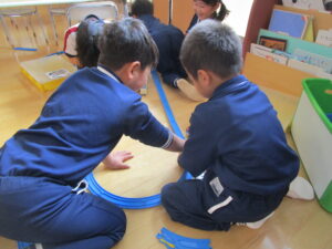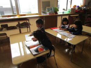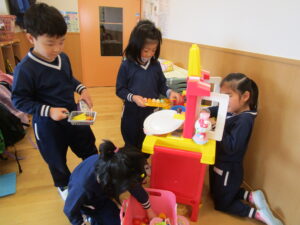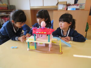 進級して4日目、今日は折り紙制作のあとお部屋の玩具で遊びました。BC組さんとは違うA組さんの玩具にワクワクする新A組さん。人気玩具を紹介します。