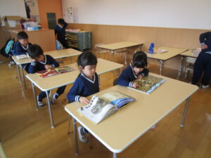 ▼給食の後は、今日決めた席に着席して食休み、絵本を読んでいます。
