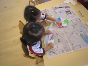 3色の絵の具を指につけ画用紙にぬりぬり。色が混ざりあう変化に『紫みたーい』『ピンクがいなくなっちゃったー』なんて声も聞かれました。