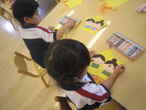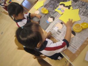 顔を描いて飾りのスズランテープを割いていきました。子どもたちも簡単に出来、ふわふわーっと喜んでいました!