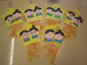 織姫と彦星の髪の毛を貼る時にはつるつる頭にならないようにね!としっかり貼りました。