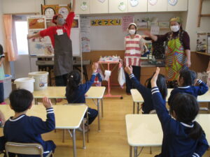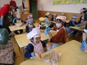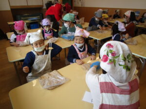 地域の農家さん宅のお庭でおこなう予定でしたが、あいにくの雨。場所を保育園に変更しての実施となりました。