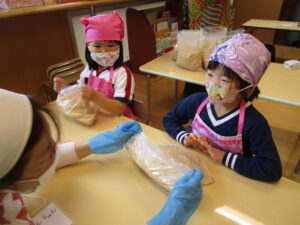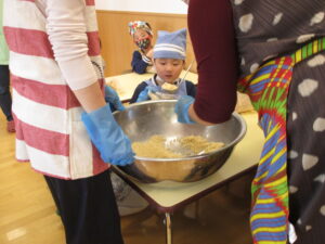 お豆の入った袋を受け取ると、「うわー!きなこの匂い」「納豆だよ」「おみその匂い」と匂いを感じ、「あったかい」「やわらかい」と手での感触も味わいました。