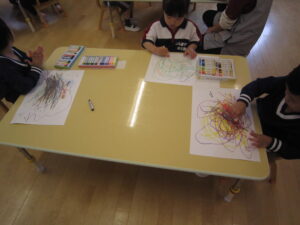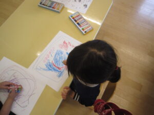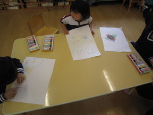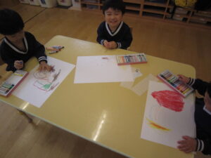 5/15(月)【わくわくC】経験画 2023/05/15 金曜日の親子遠足、クラス全員で元気に参加することが出来ました。ありがとうございました。 朝早くからのお弁当作りもありがとうございました。「みんなとても美味しそう!」にこにこと楽しく食べていましたね。 今日は、みんな大好きお弁当を思い出して描きました。 ▼おにぎりにぶどうにいちご。 ▼すきなおかずをたくさん詰めてもらったね。 わくわくC組 松下