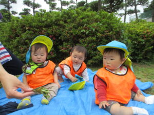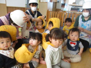 今日は避難訓練を行いました。先月は真ん中に集まる練習。今月は防災頭巾を被る練習を行いました。