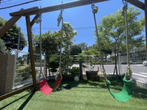 たんぽぽキッズの人気スポット ” ぶらんこ広場 ”。 ヤマボウシが、今このぶらんこ広場できれいに咲き誇っています。