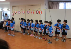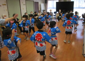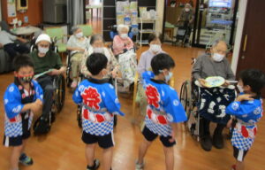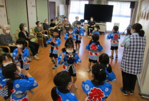 7月は『はっぴ姿』でココファンさんへ。『たんぽぽ夏まつり』で作ったうちわをプレゼントし、盆踊りを披露しました。「可愛いですね」「楽しかったよ」とのおじいちゃまおばあちゃまの声を聴き、連日続く暑さに少しでも【涼】ならず【元気】を届けることができたと嬉しく思えたA組さんでした。