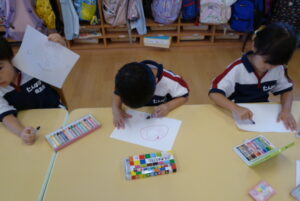 年度当初は顔の輪郭も〇にすることが難しかったのですが、くるっと円を描いたり、顔のあるべきところに目、鼻、口を描くことができるようになっています。
