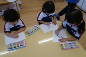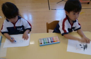 自分の顔をクレヨンで描きます。目はいくつ?」「鼻はどこ?」「くちびるって何色?」ひとつひとつ確認しながら、描きました。