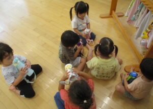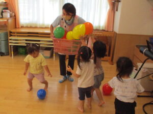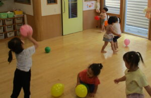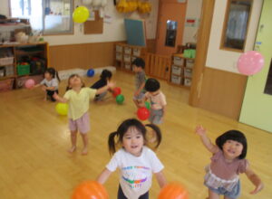 今日はお部屋の中で風船あそびをして過ごしました。風船を高く上げて取ったり、お友だち や保育者とキャッチボールをした後は、子ども達 vs 保育者で風船入れ競争をしました。子どもたちがとても早く風船を集めてかごに入れていたので、保育者は手も足も出せず…。結果はもちろん子どもたちの圧勝!たくさん遊んで汗をかいたので、お片づけをした後は、みんなで水分補給をしました。