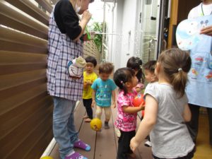最初はテラスに出るのをちょっぴり怖がっていた0歳児のお友だちも、楽しそうな声につられ、