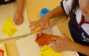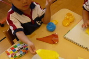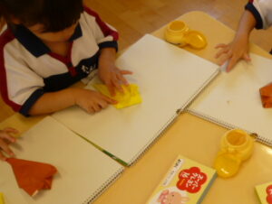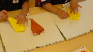9/13(水)【わくわくC】<制作>折り紙*きつね 2023/09/13 先日の運動会へのご参加、ありがとうございました。台風接近でやきもきしましたが、暑すぎもせず楽しく無事に終えることができました。 朝晩涼しさも感じられるように。秋がすぐそこまで来ていますね。 今日の折り紙制作も、秋らしいものを折りました。かわいい黄色いきつねと茶色いきつねがC組のお部屋をにぎやかに飾り立ててくれています。 ▼こんこん、きつね。 わくわくC組 松下
