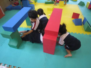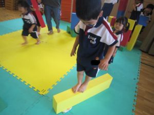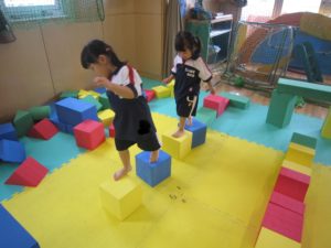 最後は保育士が作ったブロックの道を落ちないように気を付けながら渡っていきました!ちょっと転んでもへっちゃらのC組さん。たくさん遊んで汗でびっしょり。体を動かしお腹もペコペコ、その後の給食はおかわりする子がたくさんいました!