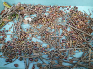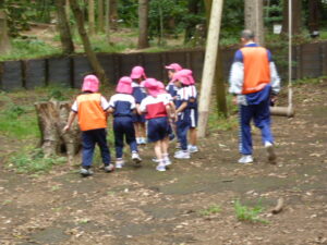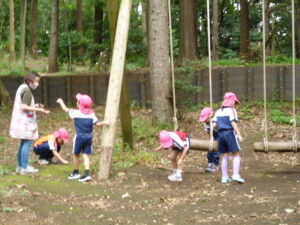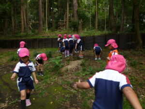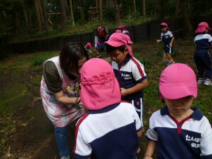 アスレチックやジャブジャブ池など楽しい遊具がいっぱいありますが、今日のミッションは、作品展に使う【どんぐり・木の枝・木の実・葉っぱ】を園代表で集めること。このミッションに忠実に、魅力的な遊具に目もくれず、ひたすら地面を見つめるA組さんでした。「このどんぐりは手にしようかな」「大きい枝があったよ、看板にしたらいいよ」・・想像が膨らみますね。どんな作品になるのか楽しみです。