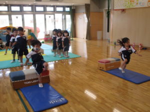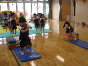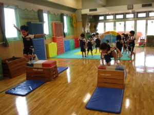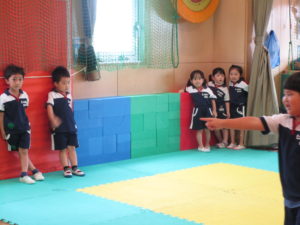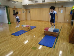 障害物走はソフトブロックを跳び越えることから始めて、今日は跳び箱の段数を徐々に増やしながらリレー形式で行いました。競うことで『勝つこと』『負けること』を経験するため、初めは消極的な子も見られましたが、高い段差も跳び越えられたことをみんなで喜ぶと、段々と自信がついてきたようで、勝敗にこだわらずに懸命に取り組んでいました。