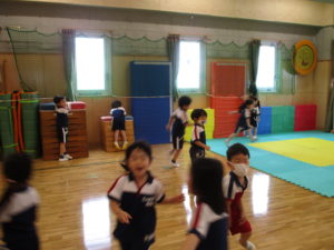 昨日、今日とホールで「色鬼」と「障害物走」を行っています。