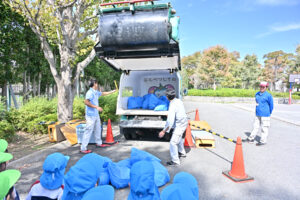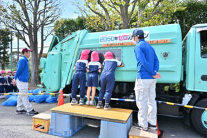 最後は会場を秋葉台公園の自由広場へぽかぽかさんからB組さんまで大集合。ゴミパッカー車を近くで見せていただいたり、記念撮影したり。ゴミの分別を学ぶだけでなく、楽しいことがたくさんの1日でした。
