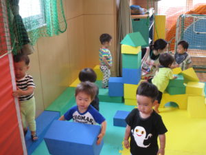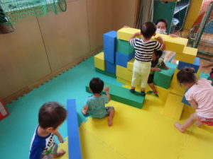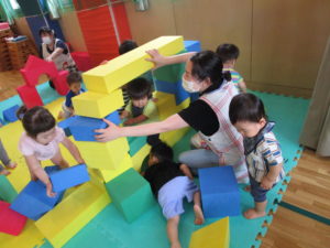 いろんな色のマットブロックで『お家作ろう』『トンネル作ろう』と、大きいブロックをよいしょ、よいしょと運び、大工さんに変身するお友だち。