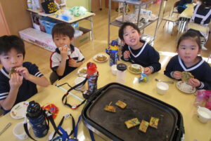 米粉を使うとモチモチ食感に!!感触や匂いを確かめた後、米粉を使ったお料理の話を聞きます。生地と野菜を混ぜてホットプレートに流し、まわりがカリカリになるのを待つみんな。チヂミが焼ける美味しい匂いに、お腹が「ぎゅるる~」と鳴ってしまいました。