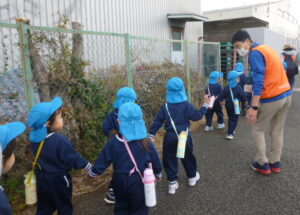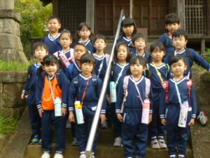諏訪神社で「大きくなりました」の報告と、「元気に育つように」のお願い。片道約1.7㎞、大人の足でも22分かかる道のりを初めて歩くC組さんでしたが、歩きやすい陽気にも味方され、楽しく完走ならず ”完歩”!!