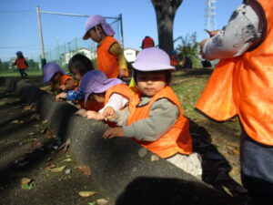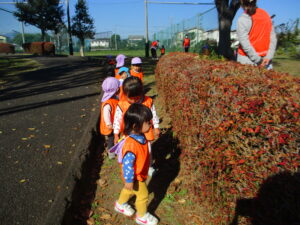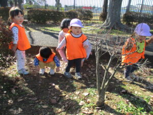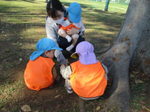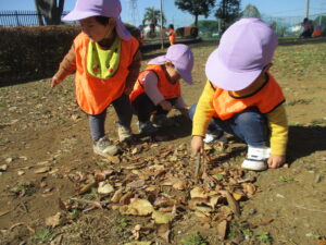 高月齢のお友だちは、カートではなく保育者と手をつないで広場まで♪ 秋葉台公園の広場に着いたあとは、みんなでたくさんの落ち葉や小枝拾い。お友だちと落ち葉の色を伝えあったりしています。虫に食べられている葉っぱに魅力を感じるようで、欠けていたり穴のあいている葉っぱをみつけては並べ、お料理ごっこを楽しんでいたみんなでした。