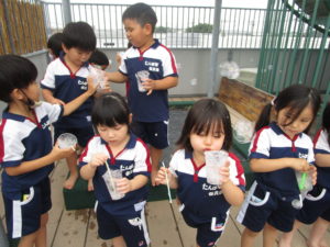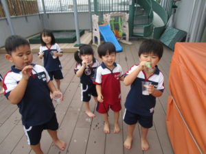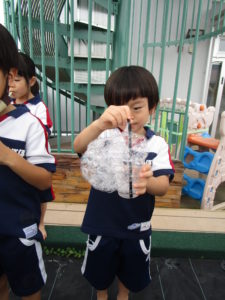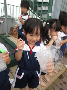 第1回目の水遊びは手作りのしゃぼん玉液を使って、みんなでしゃぼん玉遊びをしました。しかし、そっと吹くことが難しい子どもたち…。「もう!なんですぐわれちゃうの!」「むずかしいよ!」と半分おこりながらも新しい遊び方を見つけました!
