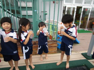 昨日、今日と雨が降らずに、待ちにまった水遊びとシャワー浴を行いました。
