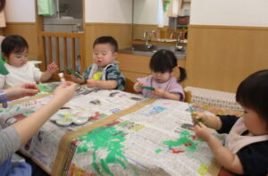 ▼絵の具スタンプにシール貼り、みんな真剣!