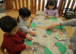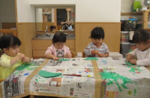 保育園にもクリスマスツリーが飾られ、サンタさんに会えるのを心待ちにするぽかぽかさん。サンタさんに届くように鈴の音を響かせ踊ってから、ツリーの制作に取り掛かります!みんな制作遊びが大好きで、真剣な表情でやっています☆ 完成したら保育室前に掲示しますので、楽しみにしていて下さいね。