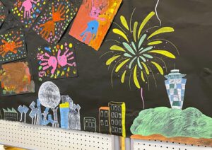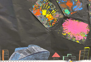 藤沢市を代表する建物の上に大きな花火が咲いています。「秋葉台体育館だ!」「あ、江の島!!」・・・子どもたちも知っている建物が描かれていました。