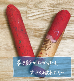 短くなったクレヨンを邪魔するのが、くるっと巻かれているあの紙。オトナでも捲るのが難しいことがあるのですが、子どもたちにとってはもっともっと難関でして。ちょうどいいところが捲れず、結局全部破いてしまう現象が、保育園でも多発しています。