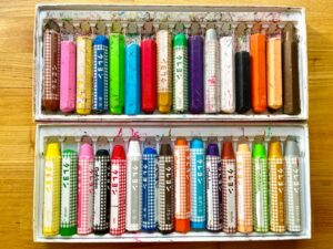 当然なのですが、何も巻かれていないクレヨンを使うと手が汚れます。手は洗えばいいのですが、製作途中の作品が汚れてしまったり、あちらこちらがクレヨンだらけになってしまい、「どうしたものかー」と皆で苦笑い。