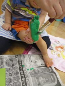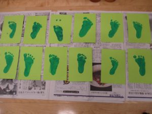 足の裏に緑の絵具を塗り、画用紙にペッタンとスタンプを押します。
