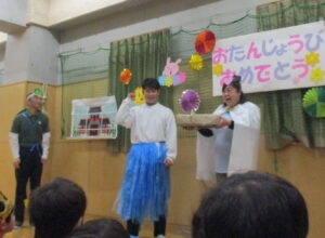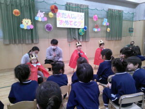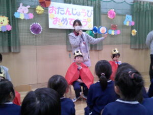 今日は1月のおたんじょうかいでした。今月は3名のお友だちが誕生日を迎えます。おたんじょうびおめでとう!