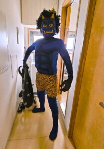 話は変わりますが、昨日の節分集会にあらわれた青鬼さん。元気なたんぽぽキッズにやっつけられて、あわわわ言いながら逃げていったわけですが、節分当日の今日は、お孫ちゃんのおうちを渡り歩き、昨日のリベンジを試みるようです。