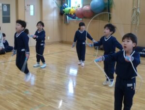 体力回復を待ってからの練習再開では恐怖心が芽生えてしまい、思い切ったジャンプができなくなってしまったり、足が開き切らず跳べないスランプに悔し涙をみせるお友だちも…それでも跳びたい気持ちは強く持ち続けての本日本番!たくさんの保護者やB組さんの視線を感じ、緊張気味のA組さんでしたが、2分間の縄跳びを披露したころにはいつもの笑顔に。たくさんの声援を受け、練習以上の力を発揮する子どもたちに感動し、溢れそうな涙をこらえていました。
