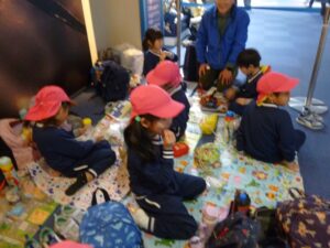 ▼ペンギンさんを眺めながら館内で昼食(※迷子防止のため、どこの園もカラー帽子をかぶったままのごはんです)