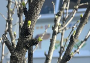木の芽起こしというにはちょっと遅く、かなりやんちゃな昨日の雨かぜでしたが、あんなにかたくとざしていた木の芽がぷっくり!みんなだいすきぶらんこ広場のムクゲ(こちら)も、前日とは明らかに違った様子。たんぽぽの入園式には間に合いませんでしたが、卒園児さんがランドセルを背負うその頃満開の桜がみられそうで、とても嬉しいです。